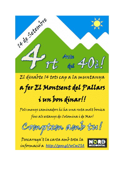 El dissabte 14 de setembre tots els antics escoltes i els actuals caps estan citats per pujar el Montsent del Pallars com a últim acte de les celebracions del 40è aniversari de la nostra Demarcació. Aneu ràpid a llegir la informació perquè gairebé no queda temps perquè us apunteu!